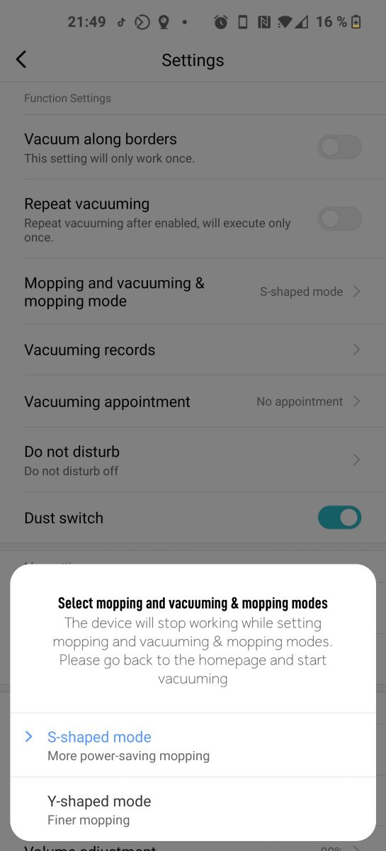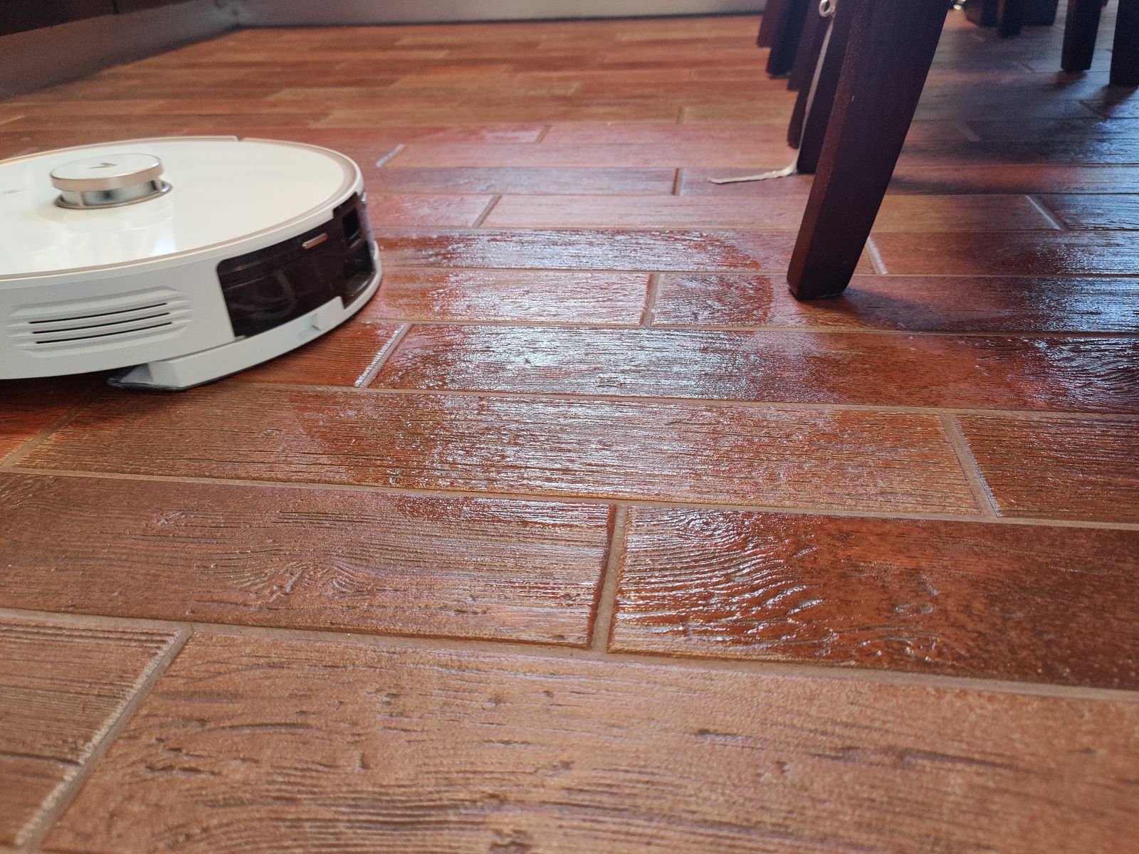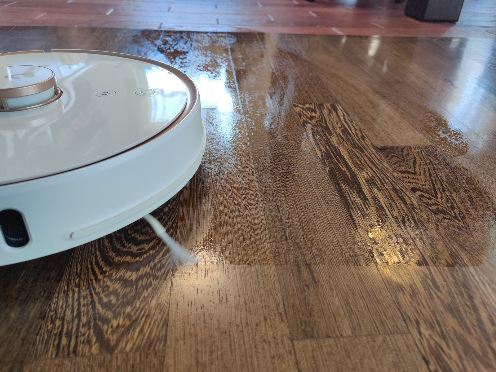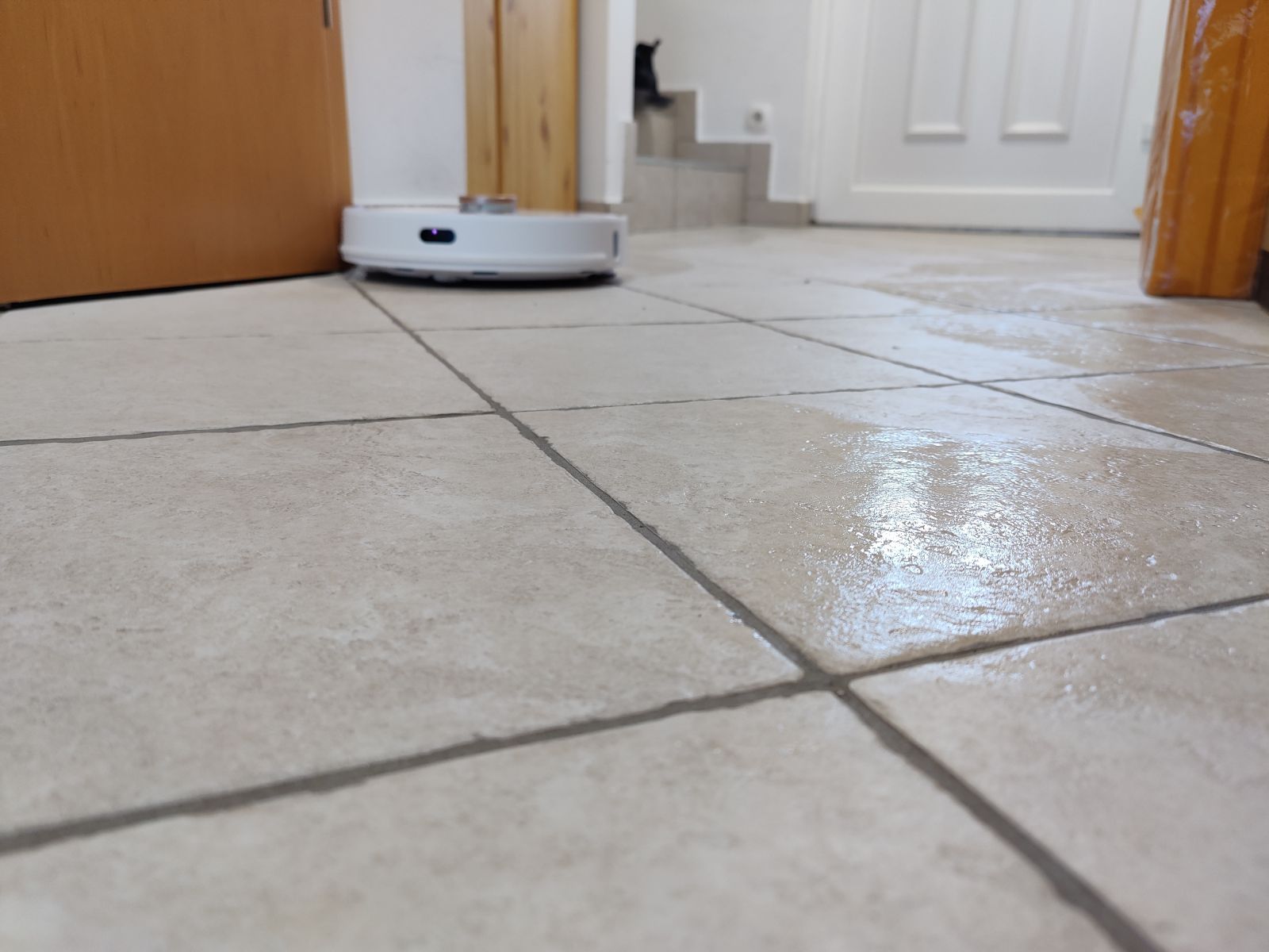 Tudi pri modelu Viomi S9 imamo možnost zagona zgolj suhega, zgolj mokrega ali kombiniranega čiščenja, kar pride še vedno prav pri učinkovitosti čiščenja, ki je najvišja če posesamo v S načinu in pomivamo v Y načinu. Pri mokrenju izbiramo med low/middle/high nastavitvijo, sam sem seveda navdušen nad najmočnejšim kapljanjem vode na nastavitvi »high« kjer so tla res občutno bolje namočena kot pri konkurenčnih modelih. Ne govorimo o lužah na parketu, a tla ostanejo bistveno bolje navlažena kot pri ostalih modelih, se pa v minuti ali dveh osušijo, sicer pa bo posodica z vodo na max mokrenju zadoščala za cca. 45m2 neto površine čiščenja (oz. 85m2 bruto površin).