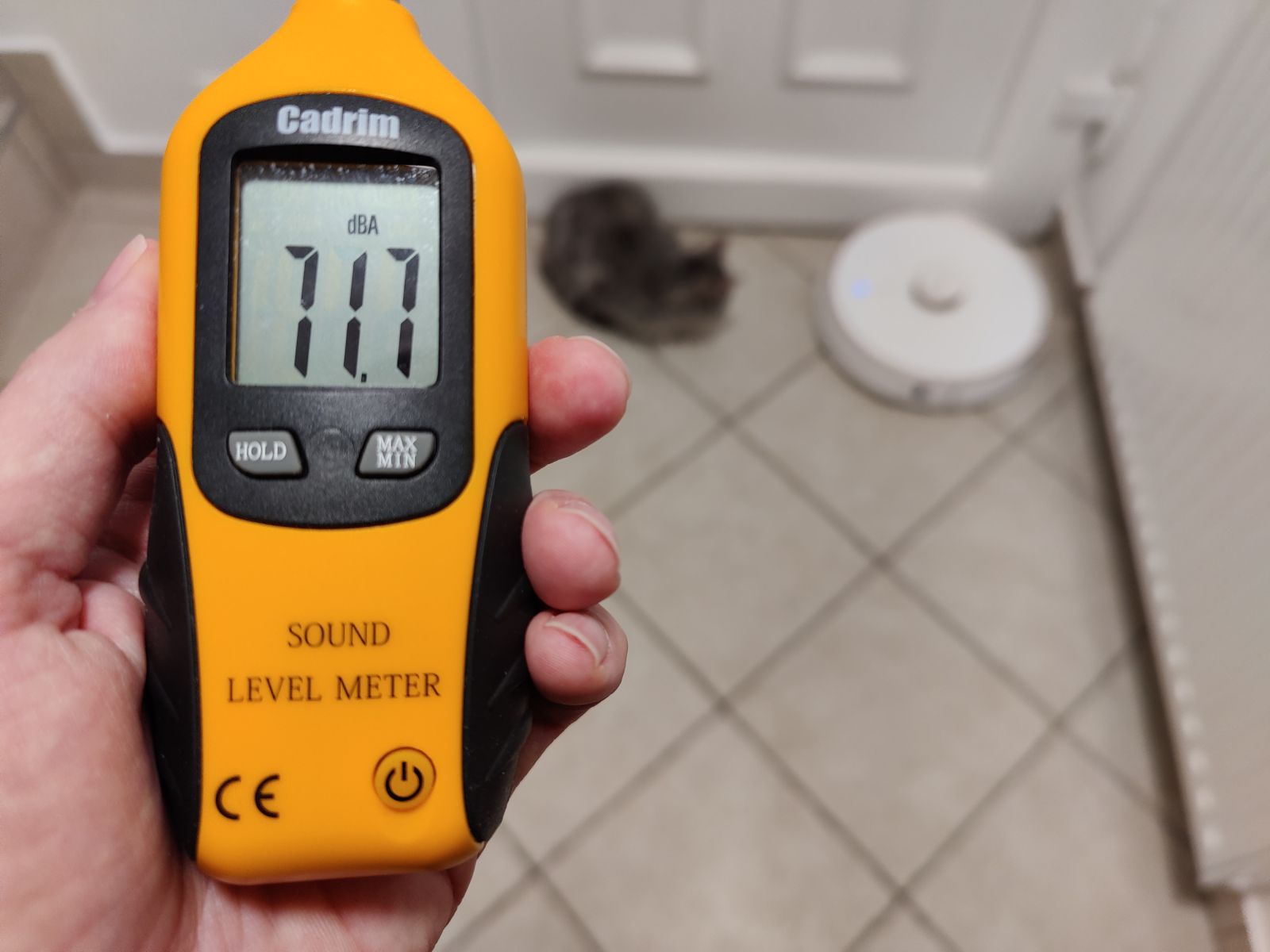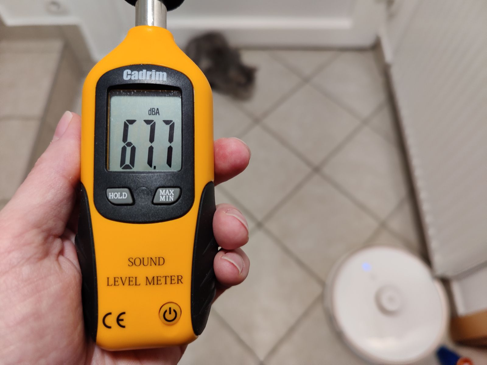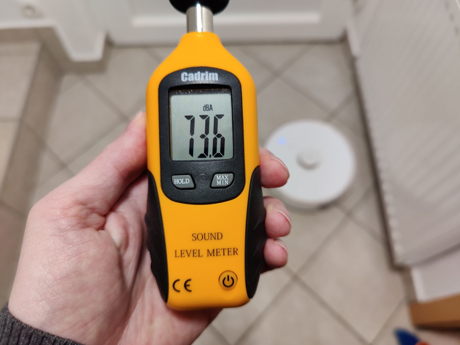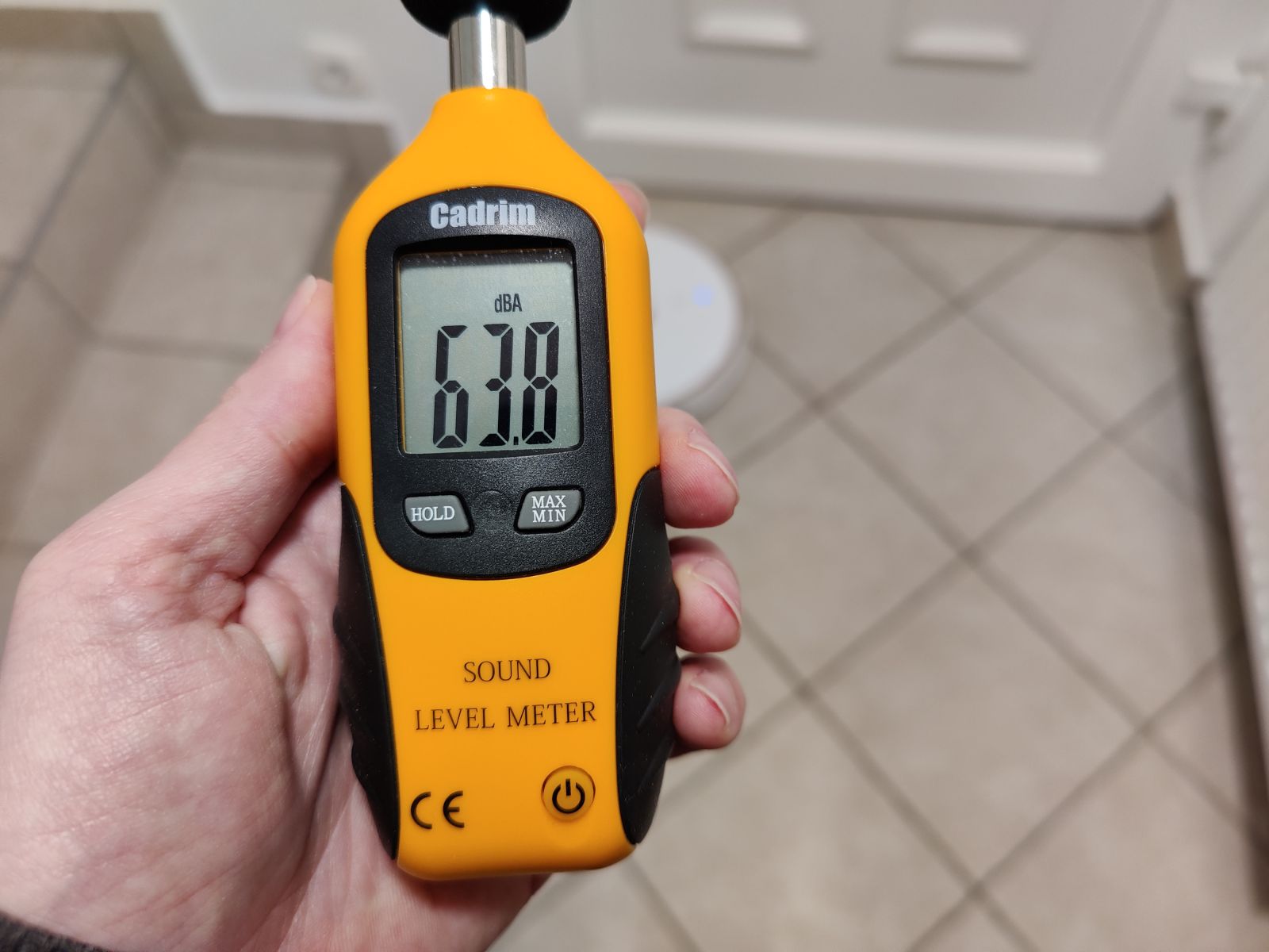 Delovanje Viomi S9 modela smo izmerili še z merilnikom glasnosti in sicer na razdalji 1m ter tako zabeležili glasnost delovanja na neravnih, reliefnih ploščicah, kjer že samo gibanje sesalnika lahko doda nekaj dB ter tako zabeležili max vrednosti, ki jih lahko pričakujete pri delovanju na različnih stopnjah sesalne moči. Rezultati so sledeči: