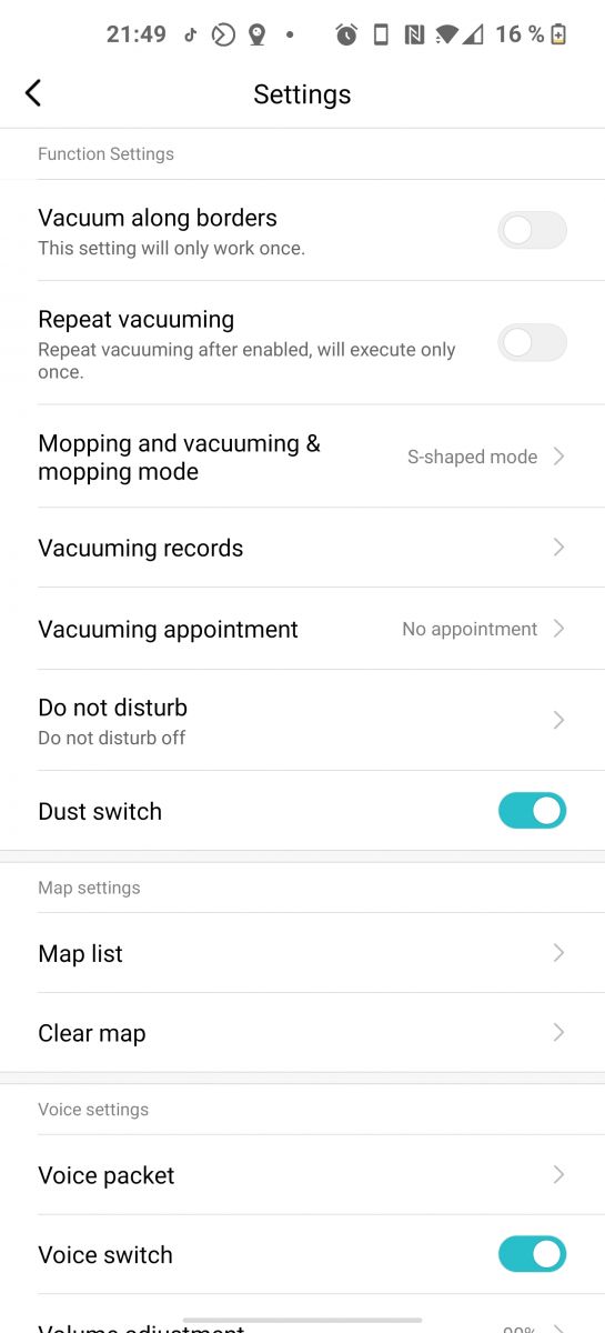 Sledi še nekaj dodatnih nastavitev oz. informacij, kjer nastavljamo ime sesalnika, upravljamo lokacije, delimo aplikacijo z drugimi uporabniki (npr. družinskimi člani), nastavljamo avtomatizacijo procesov, nadgrajujemo Firmware itd ...