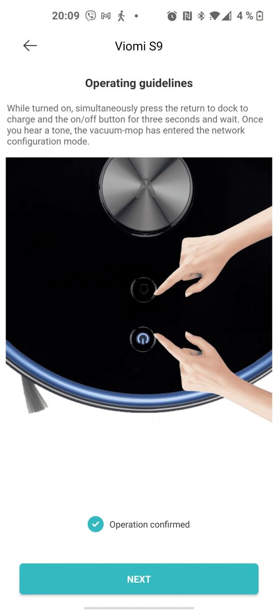 V Google Play ali Apple Store poiščemo aplikacijo Xiaomi Mi Home ter jo namestimo, se registriramo in vpišemo, izberemo regija Slovenija. V aplikaciji bomo desno od naše ID številke zasledili znak + s pritiskom na katerega bomo dodali novo napravo. Sprehodimo se navzdol do robotskih sesalnikov in izberemo model Viomi S9, kliknemo nanj, nato pa sledimo navodilom v aplikaciji, ki narekuje, da na sesalniku pritisnemo oba gumba hkrati in s tem zaženemo povezovanje s aplikacijo preko domačega WiFi omrežja. Ko prično lučke na sesalniku utripati v aplikaciji potrdimo delovanje, počakamo da aplikacija najde in prepozna sesalnik in nam ponudi spisek WiFi povezav, med katerimi izberemo našo WiFi omrežje, preko katerega imamo povezan že telefon. Označimo kvadratek, da se strinjamo s pogoji in počakamo, da se aplikacija in sesalnik uspešno povežeta, kar nam aplikacija prikazuje v štirih korakih. Če je vse ok, se bo sesalnik s tem povezal z aplikacijo in naše čiščenje se lahko prične.