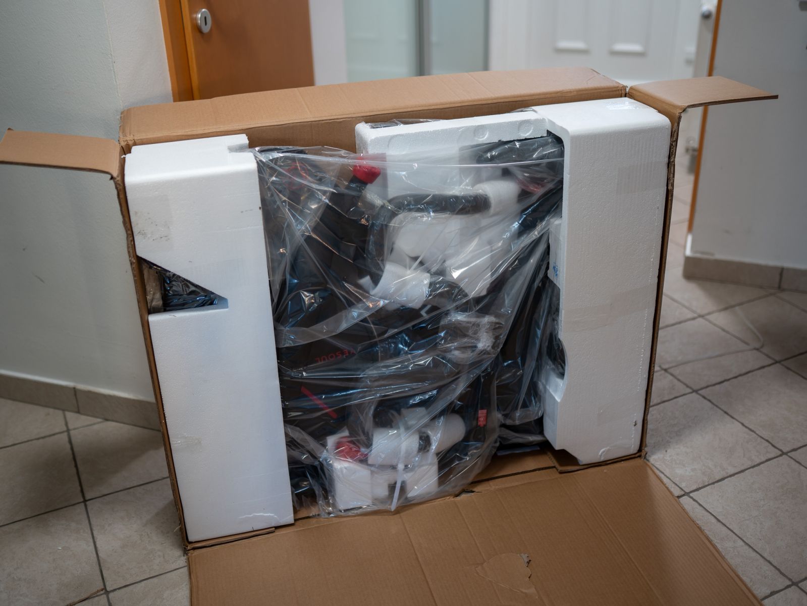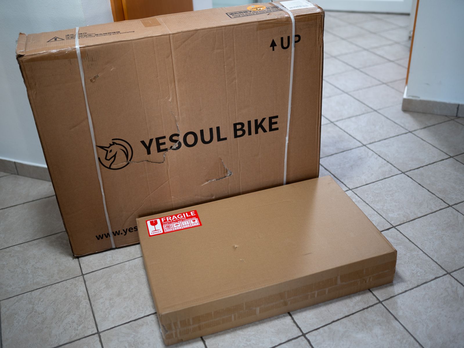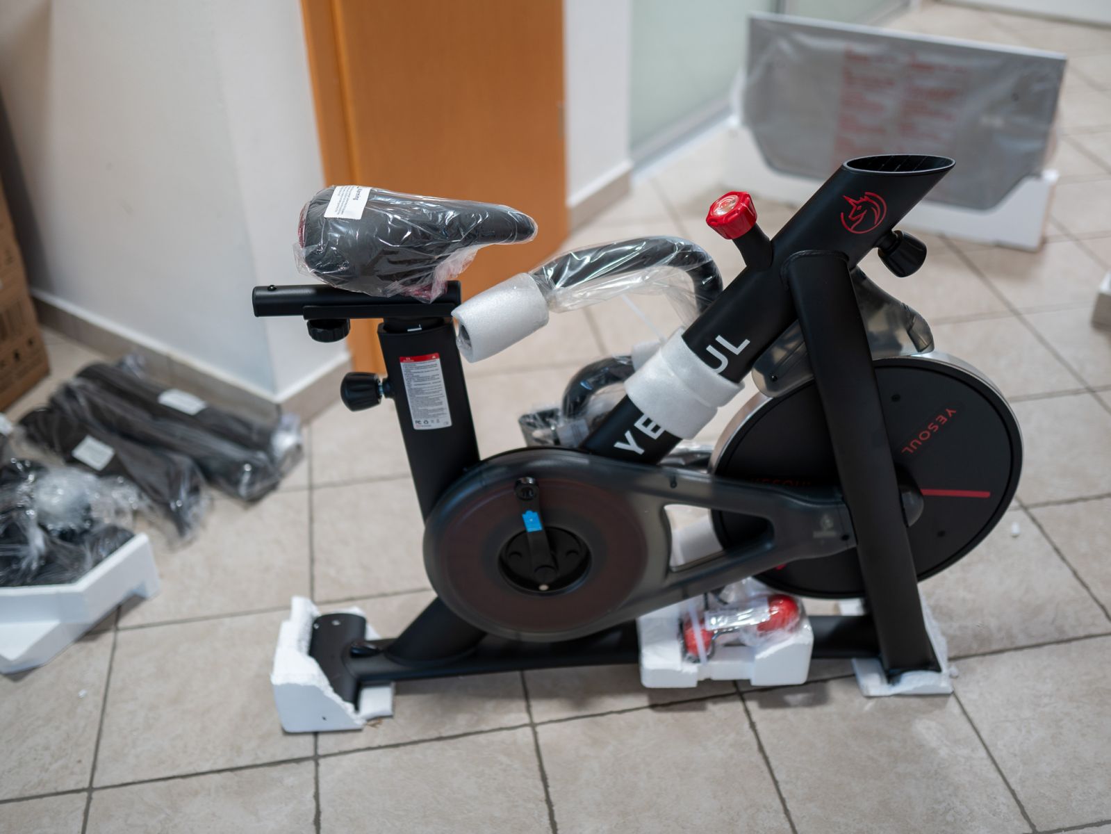 Sobno kolo Yesoul G1 Max je do vrat pripeljala kurirska družba, kolo pa je prispelo v dveh paketih. V prvi večji embalaži s težo okoli 40kg je prispelo sobno kolo, v drugi bistveno manjši in lažji embalaži pa je bil dostavljen še velik 32” zaslon ter kabli za priključitev sobnega kolesa na električno omrežje.