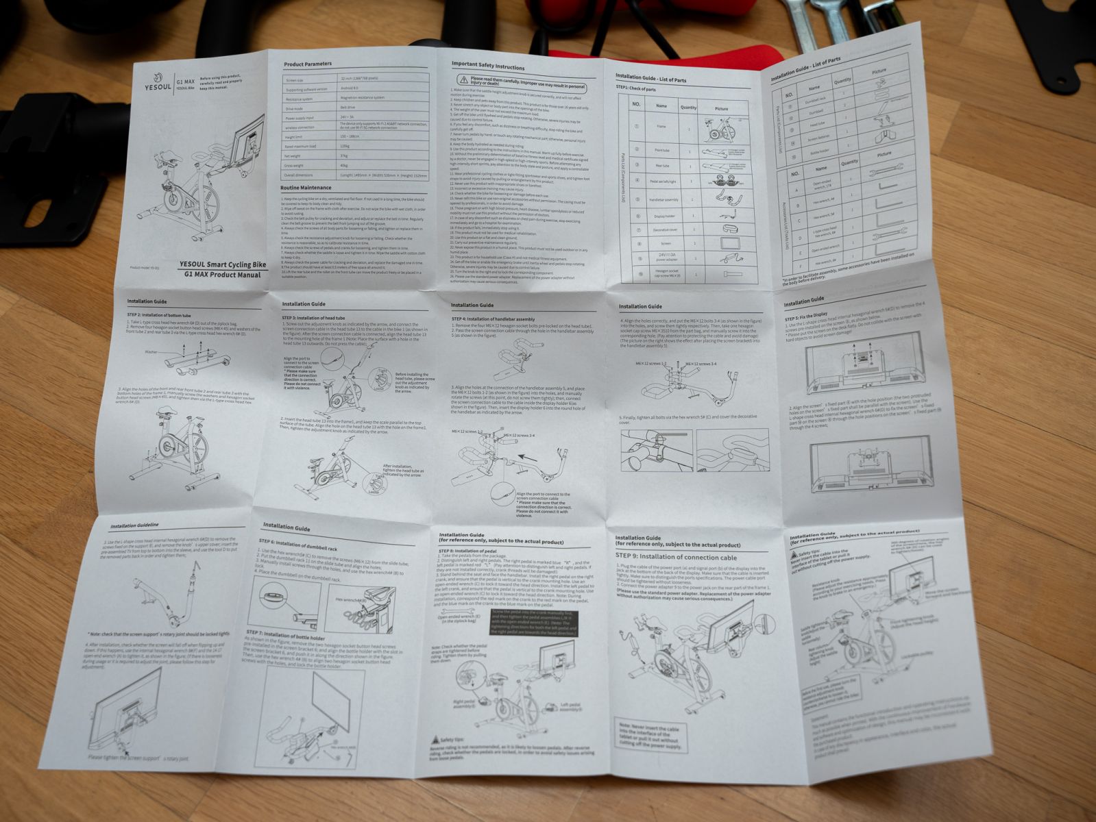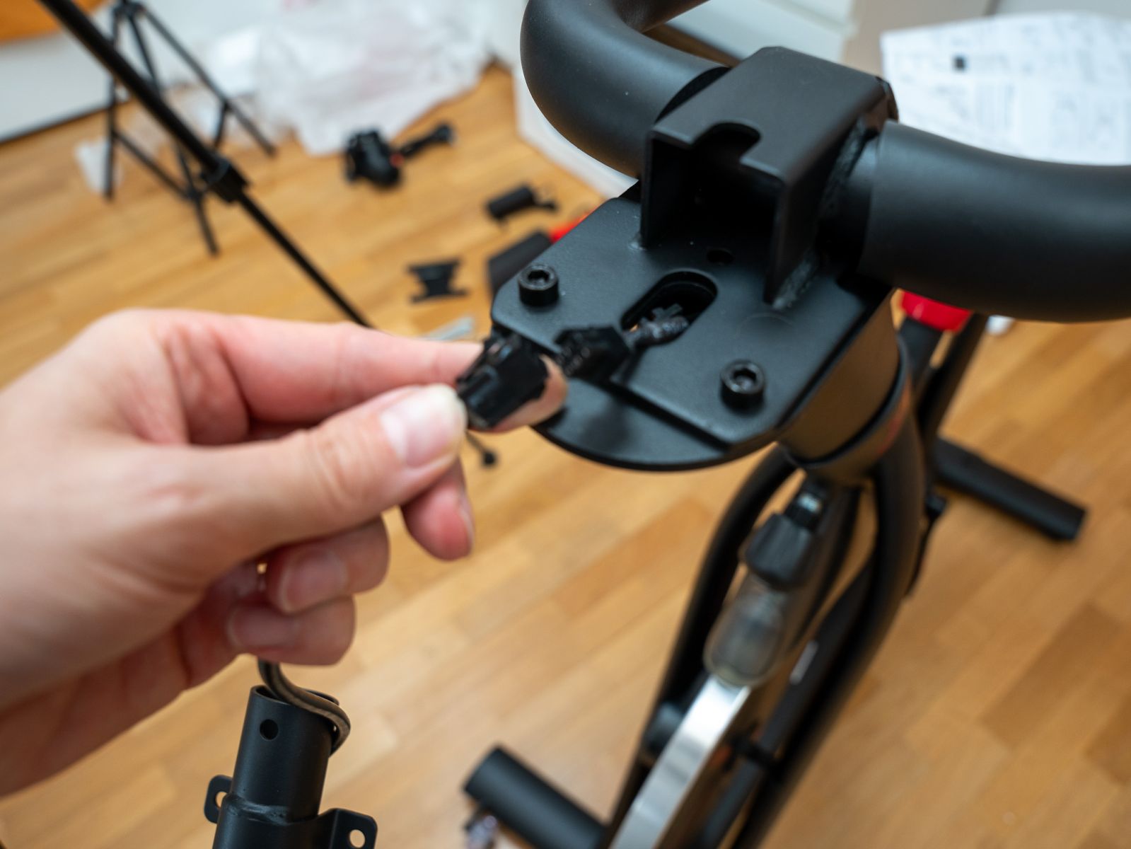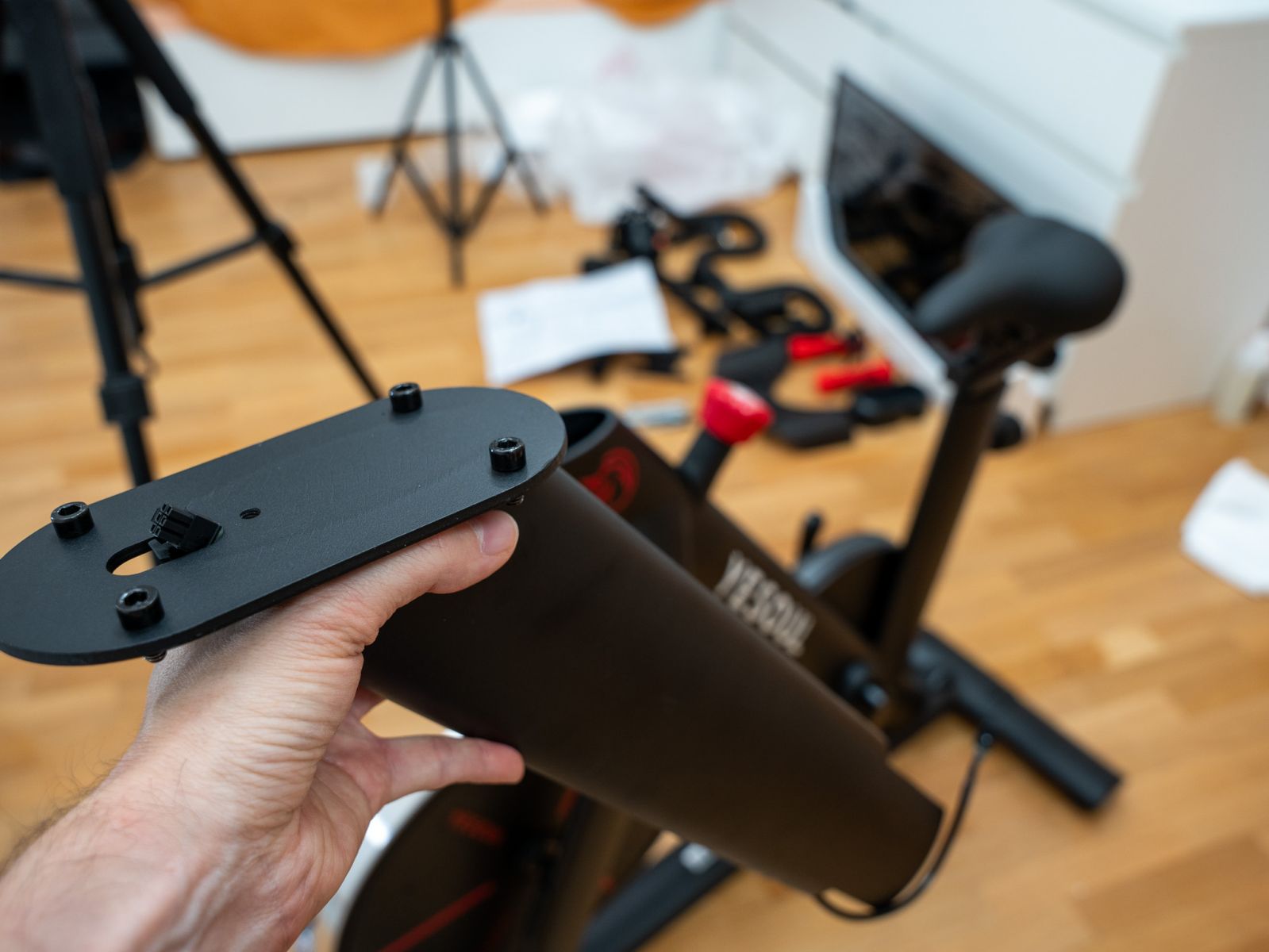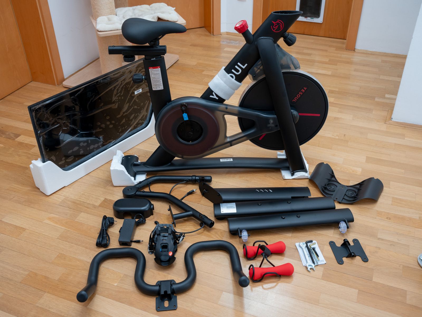 Pričaka nas lepo zaščiteno, delno sestavljeno sobno kolo, ki pa je še konkretno povezano, polepljeno ter obdano s stiroporjem in različnimi zaščitnimi penami. Kolo je v veliki meri že sestavljeno, sami bomo namestili le podstavek na sprednjo in zadnjo stran, krmilo, obe pedali ter LCD zaslon, ki ga povežemo z dvema priloženima, že nameščenima kabloma. Priloženo je tudi potrebno orodje, tako da imamo vse pri roku, sestavljanje pa bo vzelo nekje 30 min.