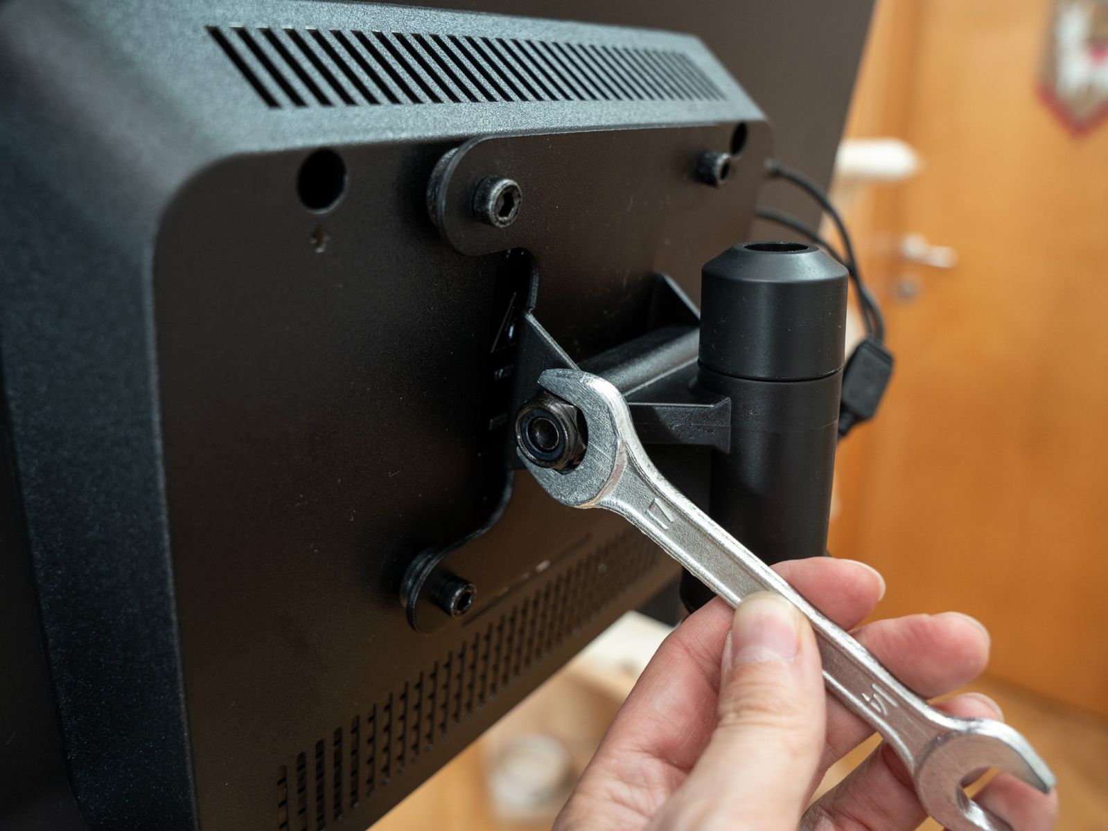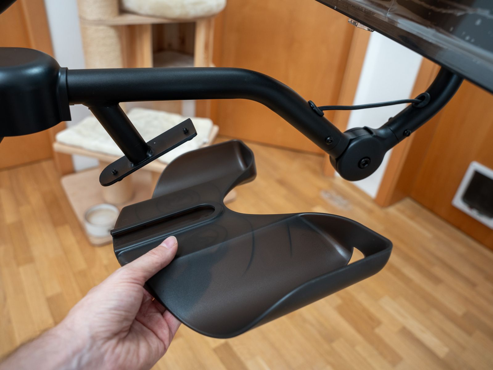 Nasproti rdečega gumba, na zunanji strani kolesa najemo vrteči gumb, preko katerega nastavljamo višino krmila. Tudi slednje ima več stopenj višine, kar prilagodimo glede na svojo telesno višino in želeni položaj telesa. Na koncu nam ostane še prilagodljivost velikega 32” zaslona in tudi tukaj imamo kar nekaj možnosti. Zaslon lahko namreč vrtimo naokoli za polnih 360° možen pa je tudi nagib do 42°.