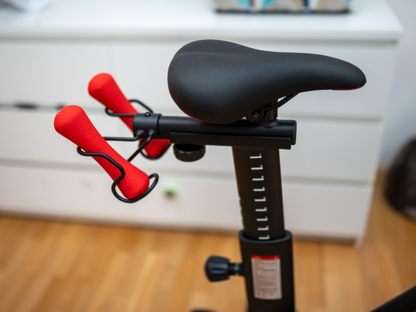 Slednjega lahko nastavimo po višini (od 69cm do 92cm) ter po dolžini, kakšen odmik od krmila želimo, tam imamo na voljo cca. 10cm. Večji uporabniki bodo seveda potrebovali večji odmik. Tudi pedala imajo možnost prilagoditve, trak, ki skrbi za dober oprijem obutve lahko namreč zategujemo po potrebi, glede na velikost oziroma vrsto obutve. Na sredini kolesa najdemo vrtljiv rdeč gumb, preko katerega nastavljamo procent upora (kako težko bo pedalirati), slednje lahko nastavljamo po stopnjah od 1 do 100.