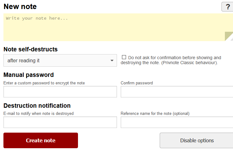Pošiljanje osebnih podatkov in gesel je danes izjemno kočljiva tema in področje, kjer moramo biti še posebej previdni. Na našo srečo tudi za to težavo obstaja rešitev. Spletna stran Privnote.com ima le en namen. Na strani ustvarimo sporočilo s poljubno vsebino, ga zaščitimo z geslom po želji, določimo v kdaj bo sporočilo zbrisano/uničeno (po določenem času, ob določeni uri, takoj po prebranem sporočilu naslovnika), po želji dodamo še svoj email naslov, kamor prejmemo sporočilo o uničenem sporočilu. Glede na ocene nekaterih splenih strani, je privnote resnično varna metoda pošiljanja kočljivih podatkov, če pa bo storitev prepričala tudi vas ...