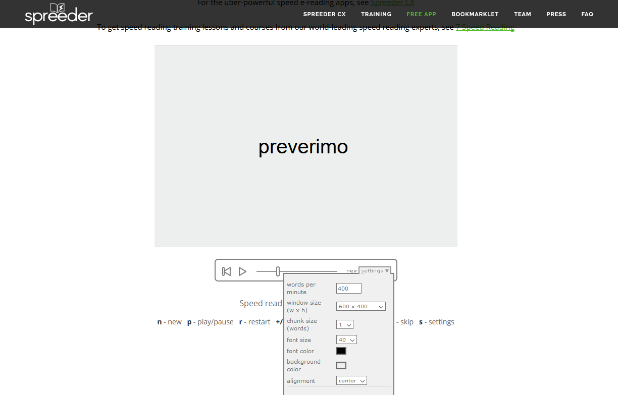 Ste že slišali za hitro branje? Človeški možgani so namreč sposobni precej hitrejšega branja in dojemanja vsebine, kot si ga sicer sami zastavimo. Branje knjige je sicer užitek in pri tem opravilu ne gre hiteti, ko pa moramo pregledati oz. prebrati večjo količino vsebine v krajšem časovnem obdobju, pa nam bodo veščine hitrega branja še kako koristile. Spletna stran speeder.com nam omogoča prav slednje. V polje prilepimo poljubni tekst (v kateremkoli jeziku), vmesnik pa nam bo prikazoval npr. besedo za besedo, v hitrosti, kot si jo bomo sami nastavili. Osnovna nastavitev je 300 besed na minuto, sami pa imamo možnost natančnih nastavitev. Nastavimo lahko poljubno hitrost prikazovanja besed, število prikazanih besed hkrati, velikost okn,a velikost črtk, barvo črk in ozadja, poravnavo itd. Nas je sposobnost hitrega branja zelo pozitivno presenetila.