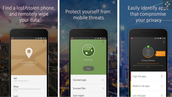 Tudi McAfee je precej znano ime v svetu antivirusnih programov. Poleg samega skenerja pa brezplačna verzija vključuje sledenje izgubljeni napravi, kot tudi zaklepanje in brisanje podatkov na daljavo. Če je naprava ukradena, lahko aplikacija celo slika kradljivca.
