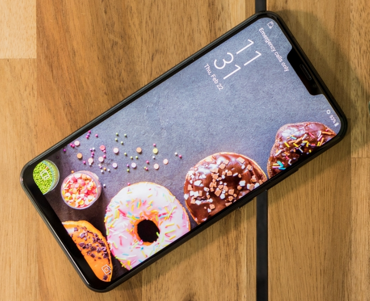 Sprednjo stran telefona krasi zaslon velikosti 6.2'' v razmerju stranic 19:9 s FHD+ IPS zaslonom, ki ima izjemno visoko svetilnost (preko 500nits), kar je pomembno za uporabo na soncu oz. ob močni svetlobi, pri tem pa ima telefon kar 90% »screen to body ratio« oz. velikost zaslona glede na velikost telefona, kar pomeni, da ima kljub enaki fizični velikosti npr. klasičnih 5.5'' telefonov občutno večji zaslon, pri tem pa zaradi nizke teže (155g) deluje tudi zelo kompaktno.