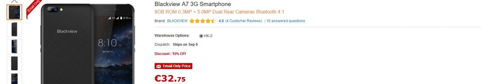 Pametni telefon Blackview A7 lahko kupite preko spletne strani Gearbest za 42€ z vključeno poštnino. Izbirate lahko med črno, belo, zlato ali modro barvo.