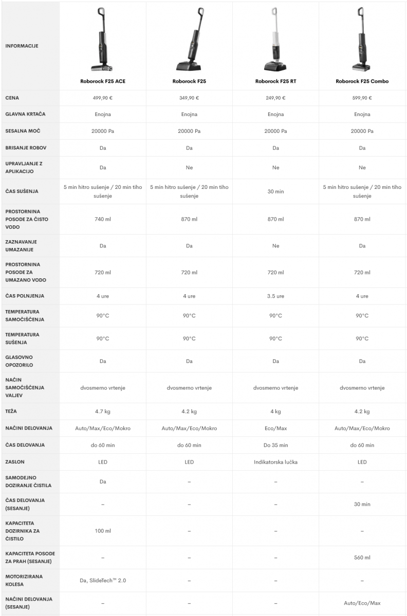 Nova F25 linija baterijskih sesalnikov prinaša kar nekaj izvrstnih modelov iz različnih cenovnih razredov, ki delujejo na področju mokrega čiščenja tal ali kot kombinirani modeli z vrsto nastavkov za različna opravila. Zopet lahko računamo na Roborock kvaliteto, visoko učinkovitost čiščenja in praktičnost uporabe.